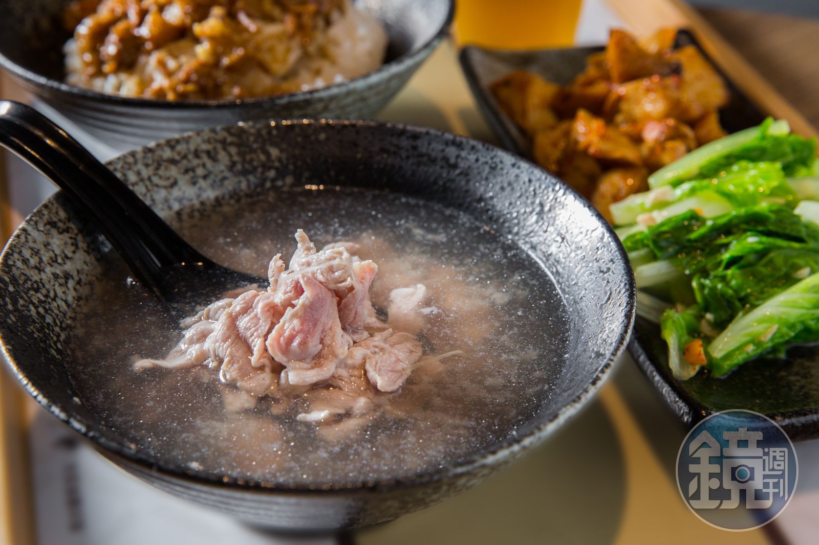 今天的重頭戲是一碗豬肉湯,我看著主廚切肉片、煮高湯,接著將滾燙的熱高湯沖入裝有小里肌的碗中,製作過程似乎很簡單,拍攝錄製完成,我嘗了幾口湯,味道非常清爽,不像牛肉湯帶點油膩感,再咬一口看似牛肉的小里肌,軟Q超柔嫩,就像館長的形容:「甘甜鮮美,讚!」