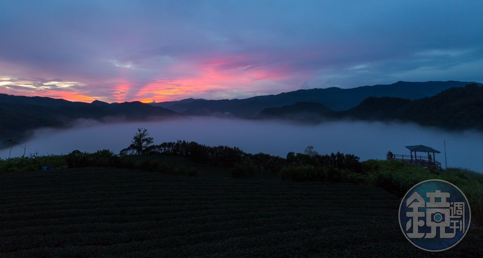 不過,想要拍到日出前景有茶園風光,就得再順著車道走下坡去。耐心等候遠方天色漸露出橘光,隱約可見山谷間一片白色雲海,沒多久,雲海開始流動竄升,此時每個人心情不斷地被雲霧變化牽動著。