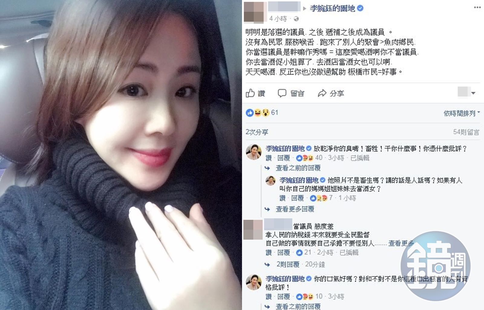 有網友今上午在李婉鈺粉絲團留言,不滿她遞補為議員卻沒有為民喉舌,諷刺李婉鈺那麼愛喝酒,不如去當酒促。粉絲團先是在下方回覆「放乾淨你的臭嘴!畜牲!干你什麼事!你憑什麼批評? 」後來又回「你的口氣好嗎?對和不對不是你這種口出惡言的人有資格批評! 」雙方留言你來我往,負評滿滿。