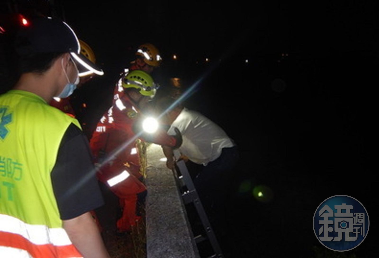 由於大排有些路段沒有路燈,一片漆黑,搜救困難,一直到快凌晨零時,警消突然發現,車籠埤大排河岸沙丘出現微弱的火光,閃了又亮,趨前一看,果然發現在溪底的林姓老翁,趕緊放下鐵梯救人,林翁則自行爬出獲救,僅右腹部有擦傷,當場送醫檢查。