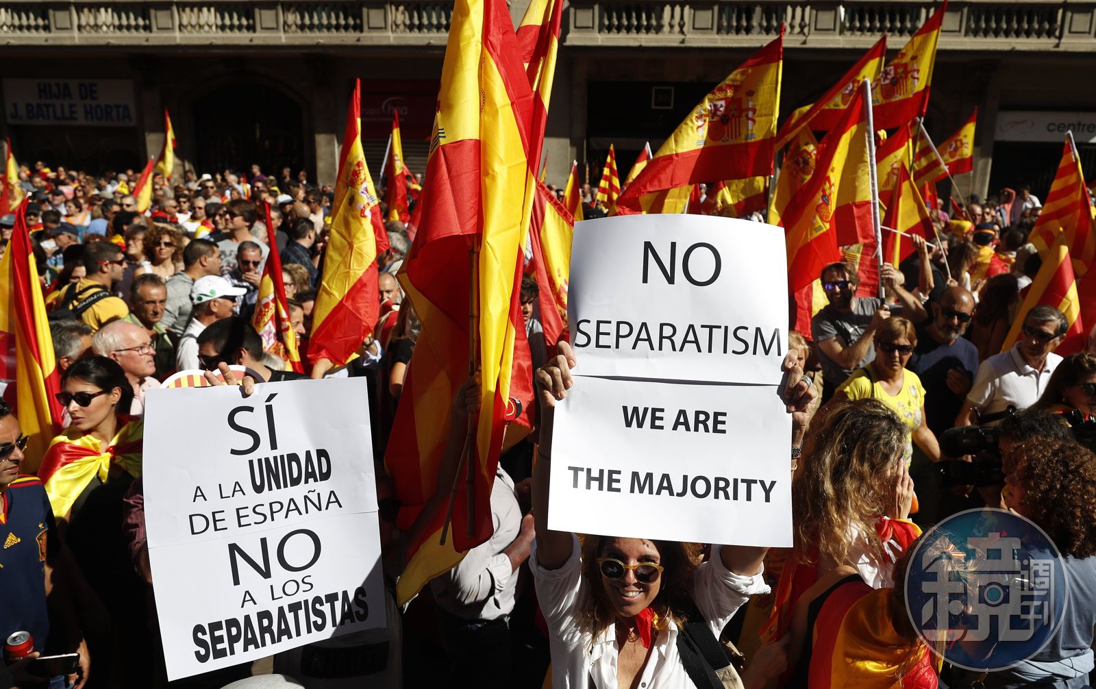 反對脫離西班牙獨立的民眾,如潮水般湧入巴塞隆納街頭。他們同時揮舞著西班牙和加泰隆尼亞的旗幟,手上的標語寫著「團結讓我們更強大」,「加泰隆尼亞也是西班牙」。
