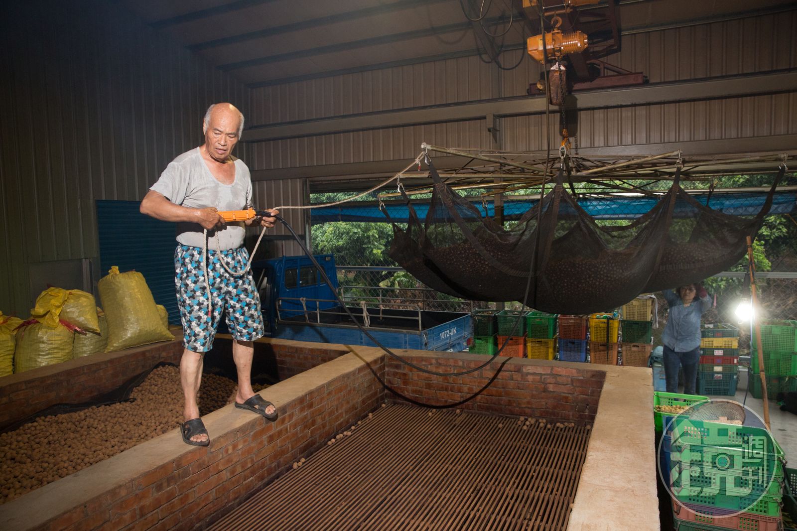 冒著山雨,母子倆完成採摘,又回到土窯寮與羅新豐一起使用機器吊臂幫龍眼翻面。羅新豐說:「傳統翻龍眼是直接走進到槽子裡,以耙子慢慢耙,但如此一來,龍眼殼容易破損,所以漸漸有人把龍眼以網子分層放置,再用機器吊臂更換上下層,好讓受熱更加均勻。」他邊操作邊說,多數果農也都老邁,若沒機器幫忙,實在吃不消。