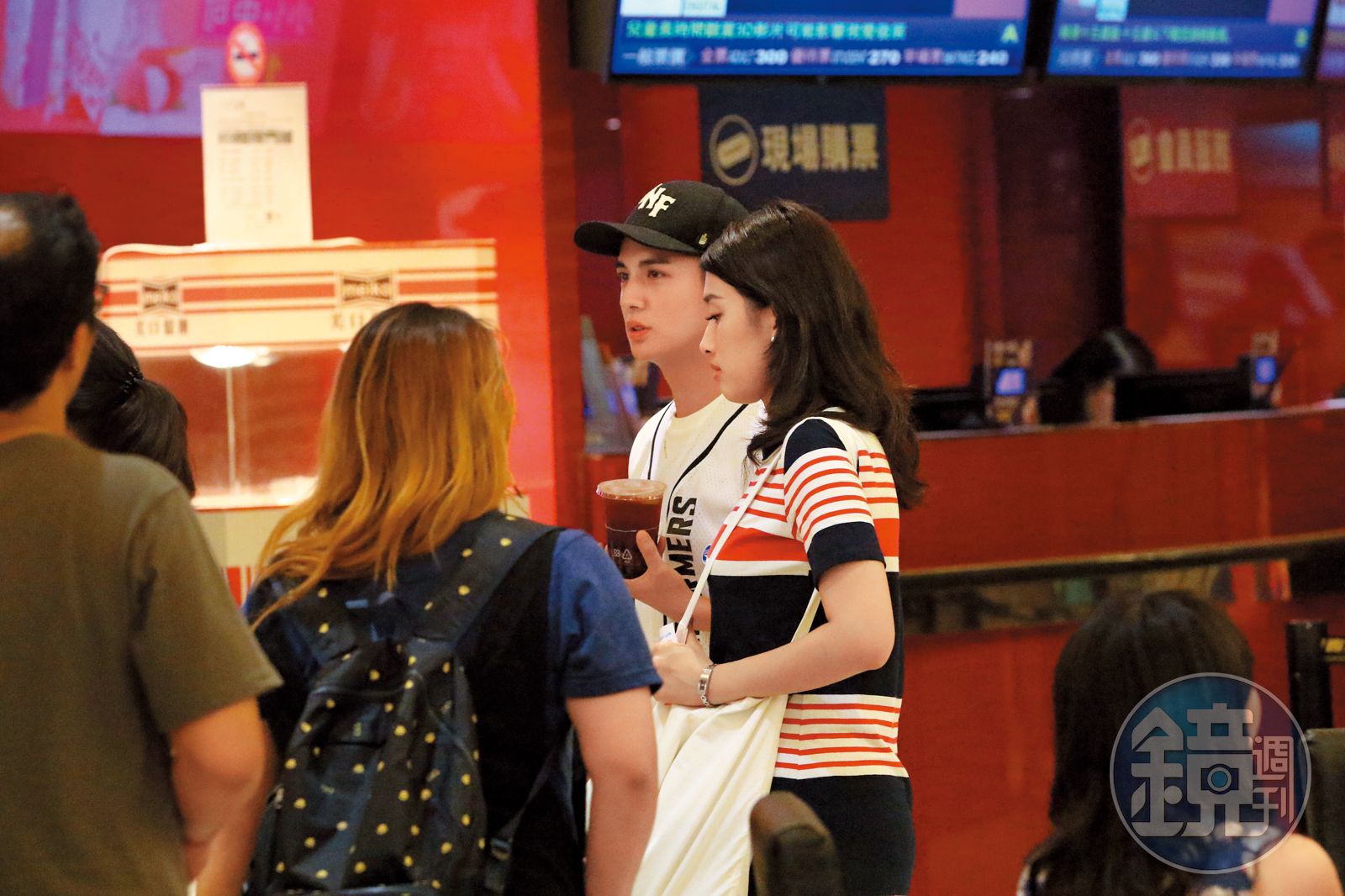 10月16日晚間近11點,本刊又目睹他們現身國賓影城看電影,小倆口似乎很熱衷在黑漆漆的電影院裡約會,不過這次卻帶了一名電燈泡男性友人同行,而令人吃驚的是,女友幾乎毫無打扮,還穿著一件阿嬤寬褲、腳踩拖鞋,彷彿把電影院當成公園,看來2人戀情應該相當穩定,所以深夜約會也無須特別妝扮。