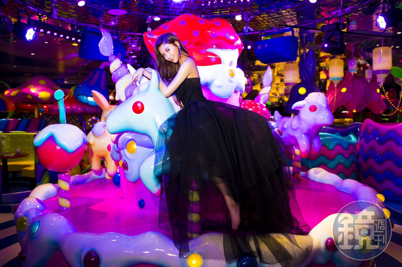 愷樂投效新唱片公司,新作品再展性感風情。(環球音樂提供)為了拍攝專輯主視覺,愷樂飛往日本東京澀谷知名的KAWAII MONSTER CAFÉ取景,被繽紛的粉色系團團包圍,但她卻穿著一身黑衣入鏡,愷樂透露:「我們想要呈現的是在這個花花世界裡,黑蝴蝶是獨一無二的。希望讓大家看到除了主持人身分以外不同的愷樂。」