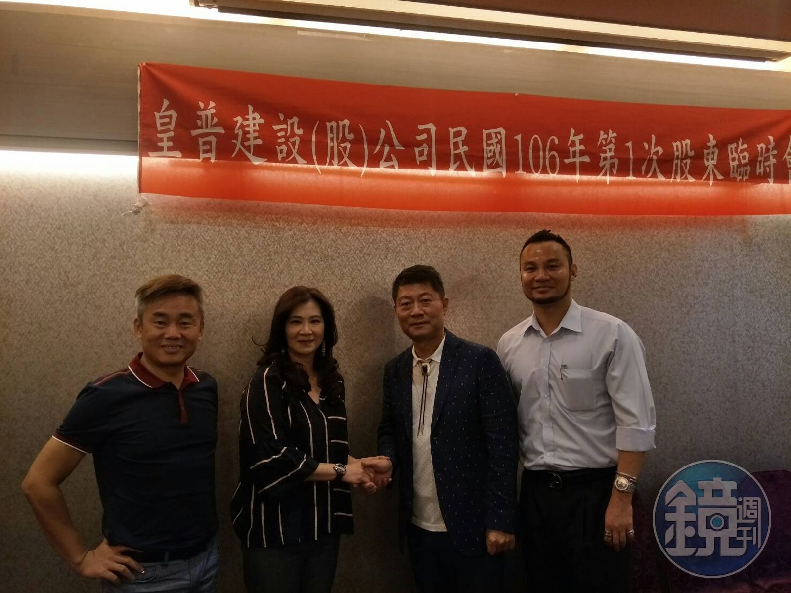 皇普建設今日臨時股東會改選5董2監,由和築投資蘇孟光、能鋐投控鄭秀雲、遠安投資蘇永平拿下3席董事,另外2席獨董由陳棟偉、陳朝城擔任。另外,寶佳機構旗下寶國建經董座陳正林(林家宏堂哥)、新理想廣告副總葉清宗擔任監察人。