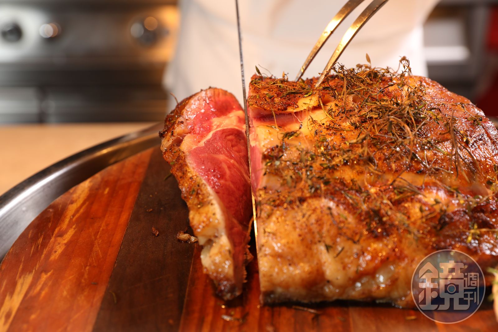 高檔Buffet標準配備「爐烤牛排」,彩匯大手筆升等食材等級,使用美國Prime等級牛肉,肋眼部位以迷迭香、百里香、鹽醃過,低溫爐烤2小時,中心粉嫩的「燒烤肋眼牛排」就能端上餐檯見客,若不喜歡太生,還能現場烙烤出焦香,非常迷人。