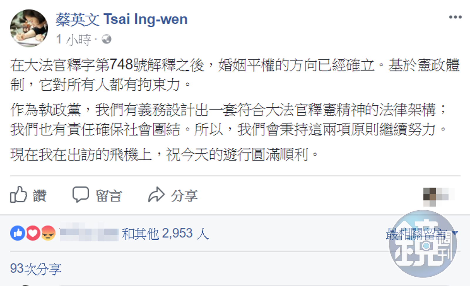 總統蔡英文在同志遊行開始後不久,就在臉書粉絲頁發文,「在大法官釋字第748號解釋之後,婚姻平權的方向已經確立。基於憲政體制,它對所有人都有拘束力。」「作為執政黨,我們有義務設計出一套符合大法官釋憲精神的法律架構;我們也有責任確保社會團結。所以,我們會秉持這2項原則繼續努力。」最後總統蔡英文還說「現在我在出訪的飛機上,祝今天的遊行圓滿順利。」