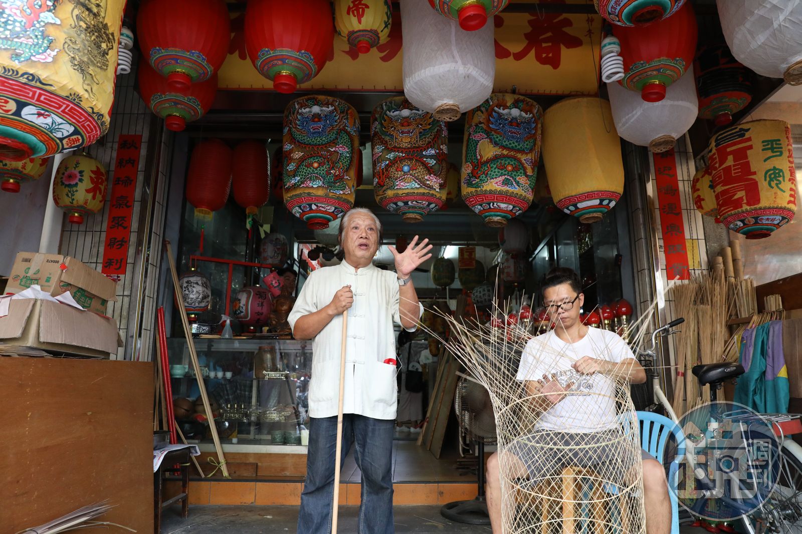 店門口掛的竹篾燈籠,使用桂竹製作。全用手工從剖竹、抽絲、編型,再到用紗布繃住燈籠外型,接著在上漿、上色、圖畫定位,才得以完成。每只燈籠製作需要耗時3個月至半年。唐秋水的小兒子放棄教職,為父親繼承家業。到訪這天只見他低頭不斷進行收尾編織,唐秋水則親手展示在燈籠上繪製的過程,只消5分鐘,一只燈籠的題字完成,還附上了粉嫩的牡丹圖。如此功力,找遍全台灣也難尋。