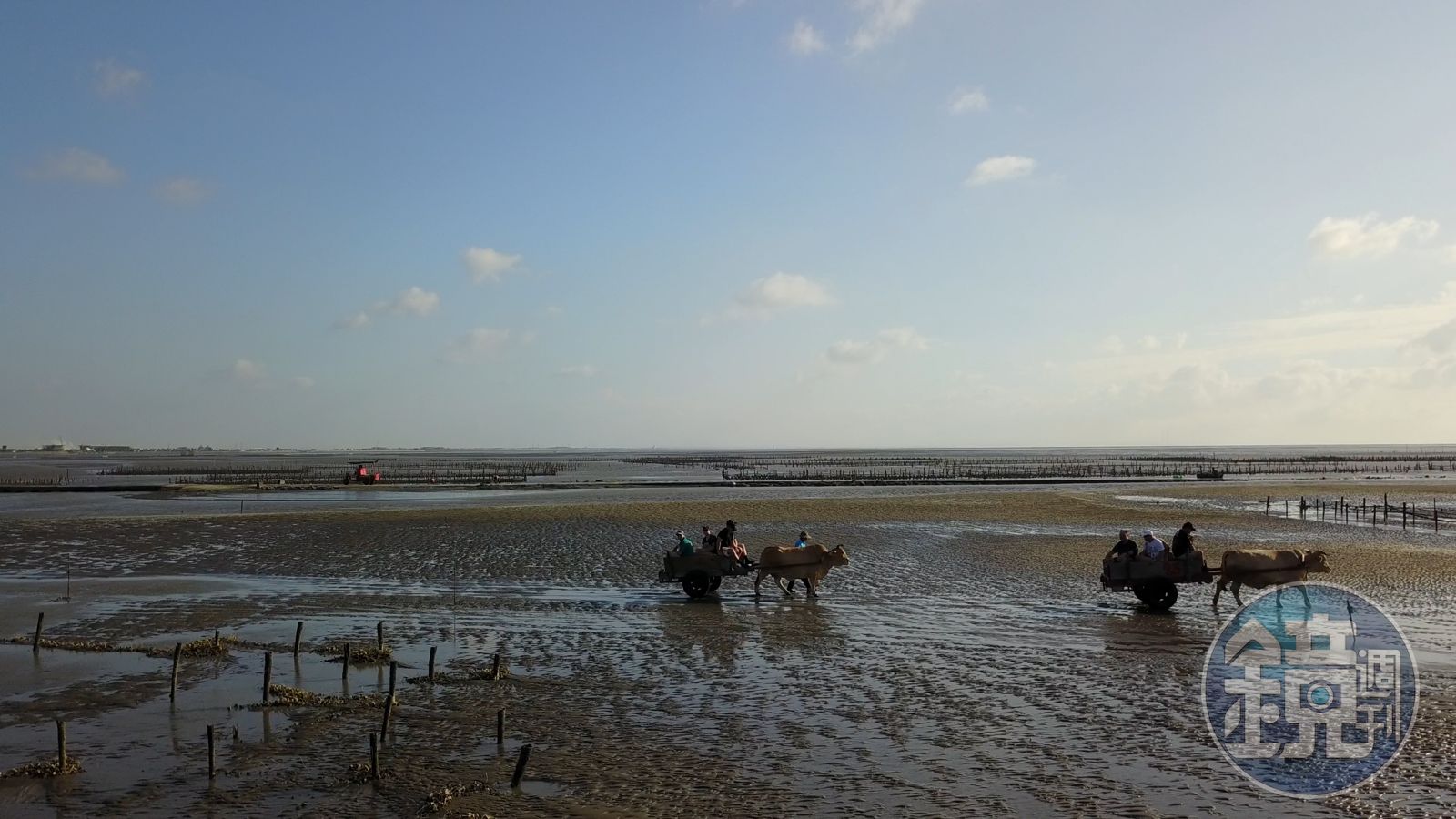旅客體驗比起討海,當然容易多了。我坐著福相阿公的海牛車,在傍晚退潮時分搖搖擺擺地進入蚵田。看著阿公輕聲與小白對話、協助旅客體驗與剖蚵烤蚵工作,夕陽把他的與小白的身影曬成長長的斜影。
