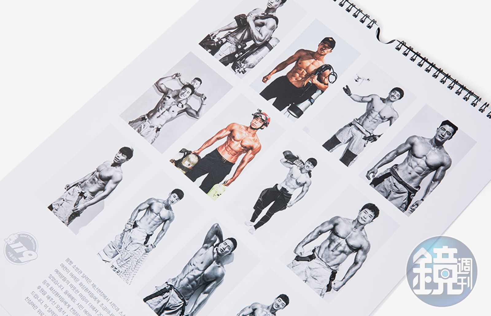 首爾消防災難本部選出12位消防員,半裸露出結實肌肉身軀,背起消防水管、氧氣瓶,或抱著小孩入鏡,流露鋼鐵男兒溫柔的一面,攝影師吳鍾永為其掌鏡,為公益不收半分錢。年曆分為桌曆與掛曆2種,售價為1萬1,900韓元(約322元台幣)。