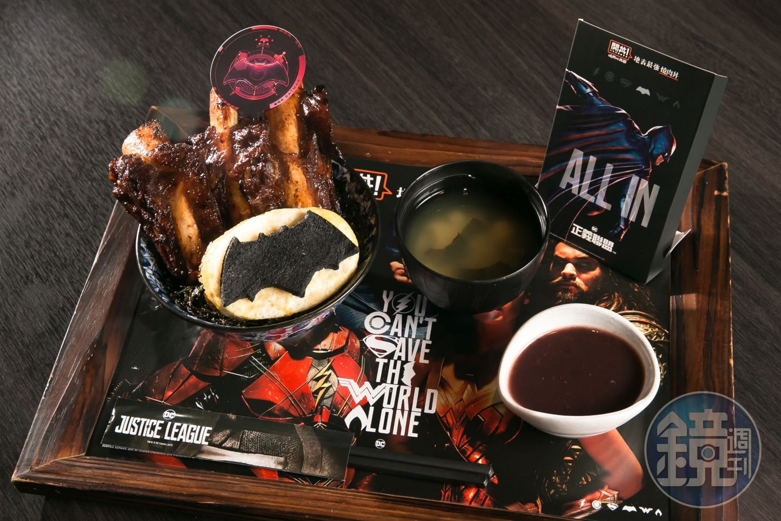 例如代表蝙蝠俠的「霸氣牛肋丼」,最上方放上以蛋液加入竹炭粉特製而成的蝙蝠俠標誌,牛肋骨先滷後烤,增添香氣。