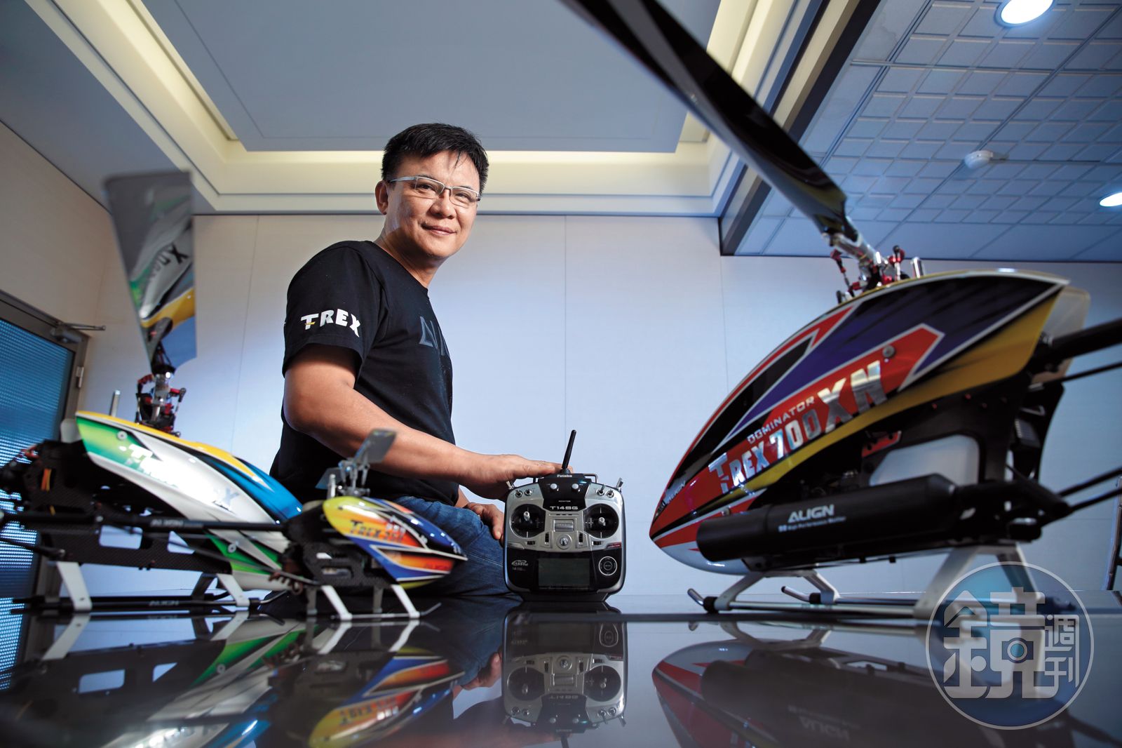 這一見,竟發現他白天數度與我們擦肩,只是他不時興身旁有部屬圍繞、不穿西裝打領帶,而是一身與員工相同的黑T、牛仔褲、棒球帽,頸上掛著擦汗白毛巾,讓我們很難從亞拓200多名員工中,分辨出他就是活動金主兼推手,更是年營業額超過15億元、遙控直升機全球市占率超過7成的大老闆。