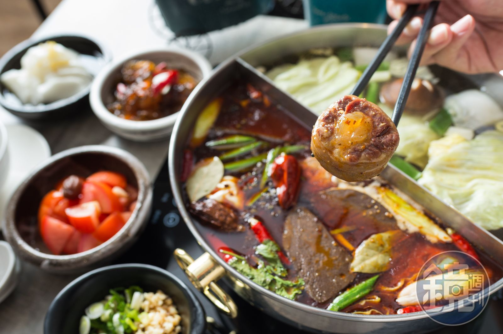 聽老闆講得這麼厲害,當然得先舀一碗麻辣湯嘗嘗,喝起來藥膳味不會太重,辣椒的香氣豐足,還有花椒的微麻,溫順好入口,果真讓我和同事忍不住又再盛了一碗,問其祕訣,老闆拉著我進廚房,3個高度及胸的大湯桶,滾著乳白的牛骨高湯,「我用牛骨湯表層的牛油去炒10幾種辣椒,不用放太多郫縣豆瓣醬和中藥材,辣醬就很香,與高湯調和後,滋味香麻醇厚。」郭承勳自信地說著。