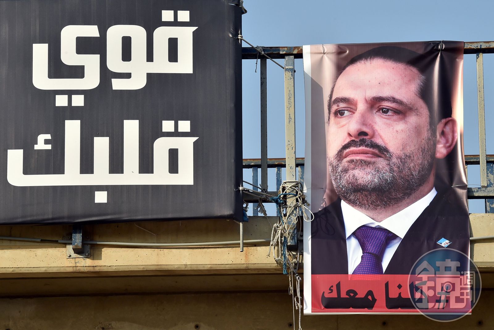 2017年11月14日,黎巴嫩首都貝魯特街頭總理哈里里的海報。旁邊的阿拉伯語寫著「我們於你同在」以及「堅強」。哈里里在訪問沙烏地阿拉伯時突然宣布辭職,媒體認定這是沙國與伊朗之間的「代理人衝突」。(東方IC)發布時間:2017.11.20 06:16 臺北時間