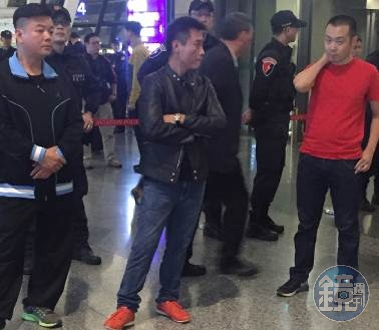 洪嫌(右1)率眾至機場圍堵香港民眾人士,並企圖衝撞警方。(刑事局提供)發布時間:2017.11.16 13:13 臺北時間
