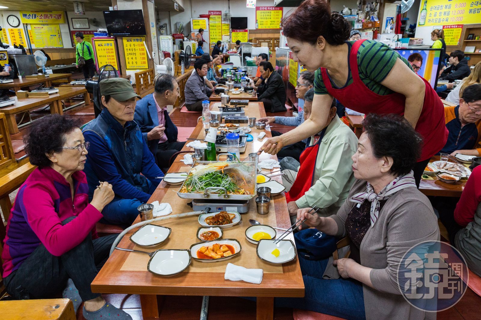 沒多久,大媽便端上一鍋紅通通的辣炒血腸、內臟,可說是招牌中的招牌,每家血腸專賣店通通有賣這一鍋,想避開它還很不容易呢!大夥圍坐品嘗,韓國大媽抱著一隻腳盤坐,這一幕彷彿韓劇場景,叫哈韓迷看得出神。
