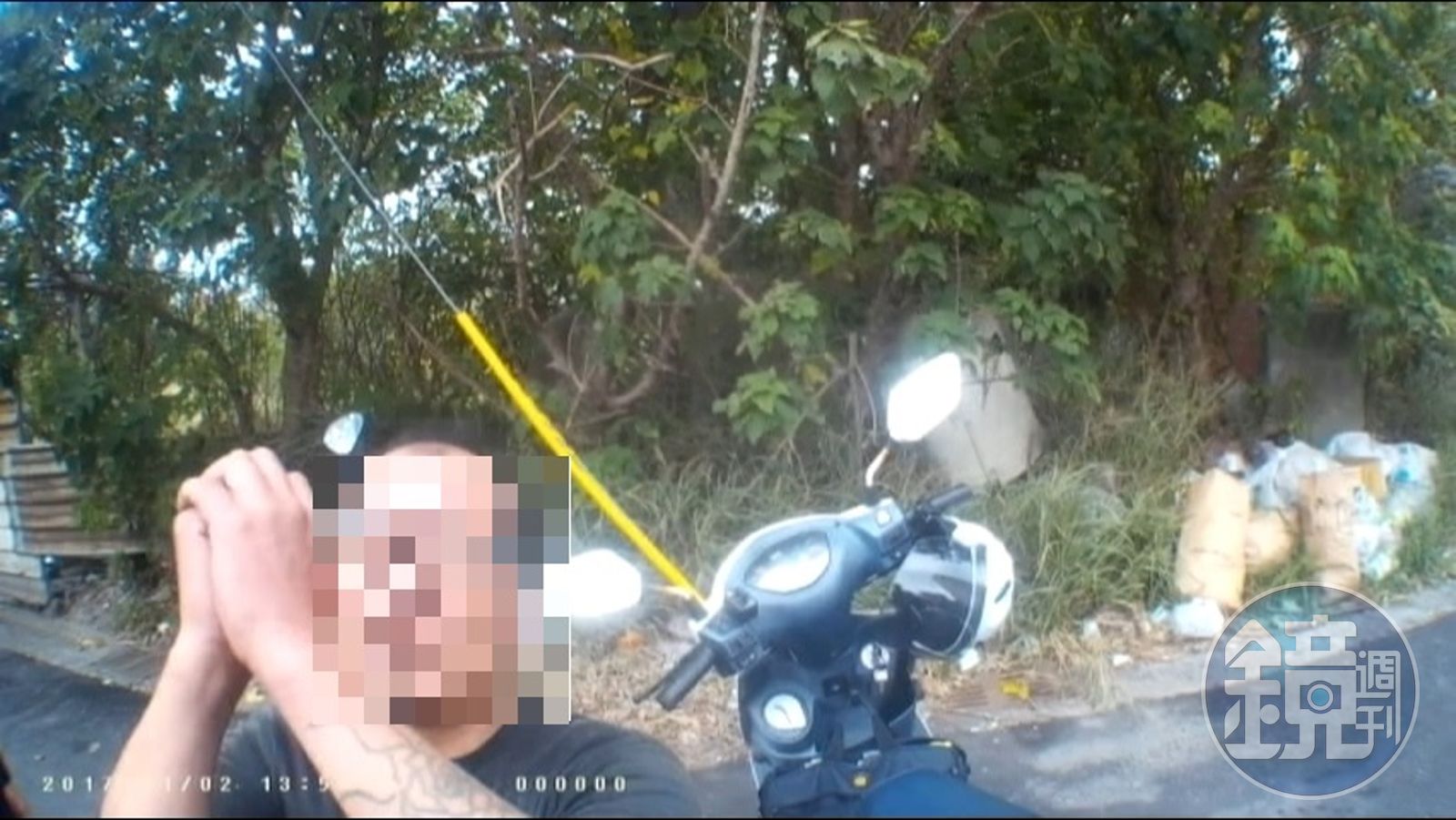 2人蹲在地上加油,形跡詭異,清水分局安寧派出所巡佐童榮智、警員陳重光巡邏經過該處,上前盤查,高嫌神情慌張,先是辯稱機車是向朋友借的,但又無法交代朋友的年籍資料,接著假裝打電話聯絡車主,企圖掩飾犯行。