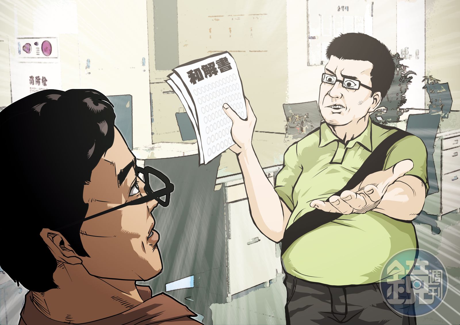 雙方對和解金的認知差距太大,在律師穿梭協調下,花了好幾個小時,最後終於達成共識。李嘉博同意在2週內支付50萬元給女老闆的丈夫,女老闆則要將位於台北市文山區、市價2,000多萬元的住家,由原本的夫妻共同持有,完全過戶移轉給丈夫,做為賠償。3人在派出所簽下和解書,總算讓醜事順利落幕。