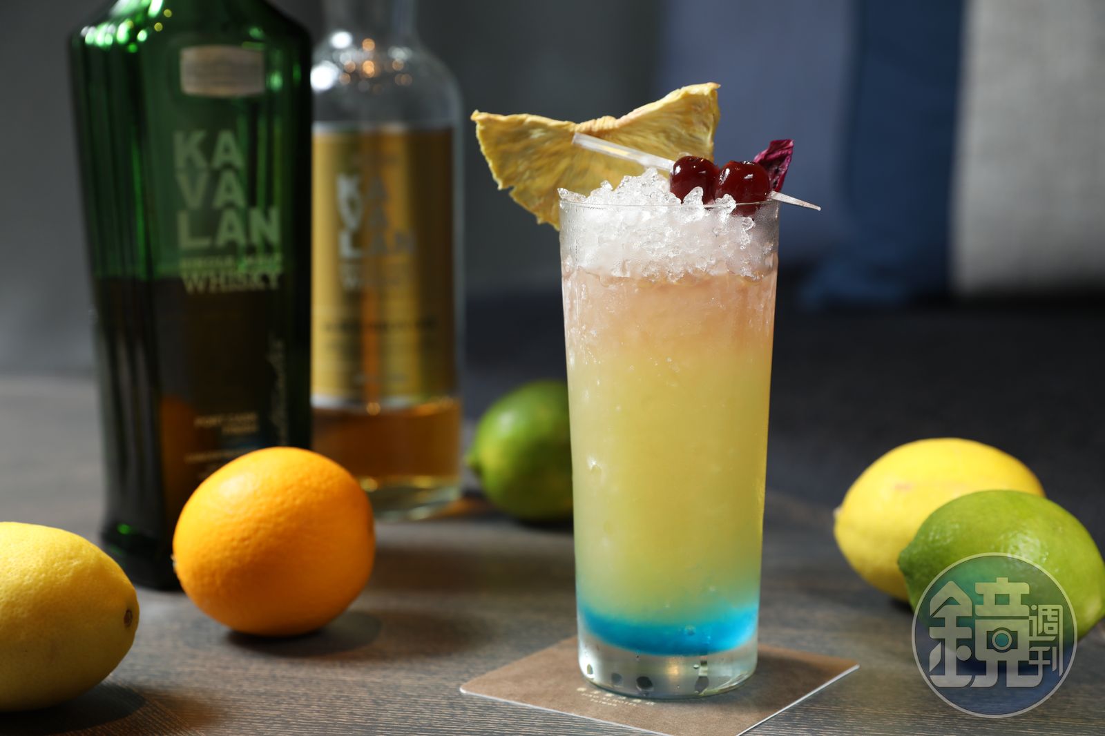 這天我接著品嘗另外兩杯以本土威士忌「金車噶瑪蘭」為基酒推出的現定調酒。首先是原型來自「邁泰」的「山川之旅」,基底由蘭姆酒改成威士忌,Kevin選用「波本桶單一麥芽威士忌」「山川首席單一麥芽威士忌」,調和出酒體厚度,且帶有些微熱帶水果、莓類香氣,加入鳳梨、檸檬汁,水果的酸甜,叫人忘卻骨子裡的酒精濃度,藍黃豔色呼應晴朗時,宜蘭的川海、天空和烈陽。