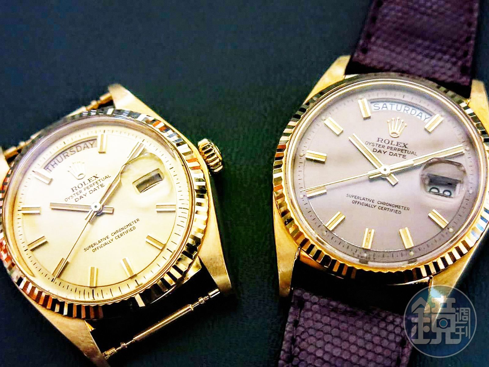 Day-Date之所以經典,在於誕生超過一甲子,外型依舊沒有太大改變。圖左及圖右分別為產於60年代與80年代之Ref.1803及Ref.18038,雖殼形、機芯及面盤構造皆不同,但不細看還真像。80年代末、90年代初之「紅蟳」代表非Ref.18238莫屬,俗稱「太陽圈」的錶框及沉甸霸氣的貴金屬「總統帶」(president bracelet),是最具「蟳味」的元素。筆者珍藏的這兩只Day-Date並非常見的金色烤漆面,而是青金石與基督血石材質,現時在收藏市場上擁有高人氣。根據資深AD店從業人員表示,現在拍賣會上身價高不可攀的不鏽鋼運動錶,80年代後期售價不過2~5萬台幣,卻往往擺在保險櫃深處乏人問津,反倒是價格高達3、40萬台幣,那時在中、南部或許可以買下間透天厝的18K金Day-Date,只要一進貨便能迅速成交。誰知風水輪流轉,品相優良、盒單齊全的Day-Date Ref.18038,如果沒有特殊面盤加持,而只是常見的金面或金色鑽面,現時也頂多值30萬,反觀從前售價才5、6萬元的不鏽鋼Daytona Ref.6265計時碼錶,目前最低入手門檻動輒百萬台幣起跳。寫到這兒,不禁怨嘆家中那可愛的老爹,當年為什麼買的是「菜蟳」,而不是「弟偷拿」(Daytona)?