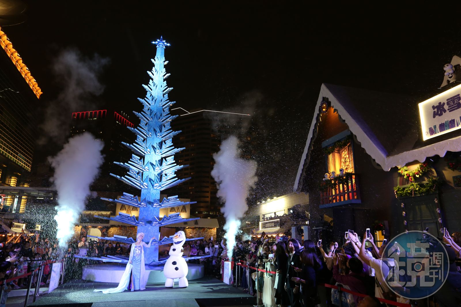 由台灣華特迪士尼公司授權指導,與野獸國、台北101共同主辦的「冰雪奇緣嘉年華」,今天在台北101水舞廣場正式開幕,園區設計以《冰雪奇緣》短篇《雪寶的佳節冒險》故事主軸發想,特別邀請到美國《冰雪奇緣》動畫師團隊跨海指導,因此從園區戶外各處,5公尺高的巨大雪怪、艾莎和安娜公主、還有依比例還原打造電影中雪寶與載滿象徵聖誕節物品的雪橇,讓冰雪迷免費拍個夠。