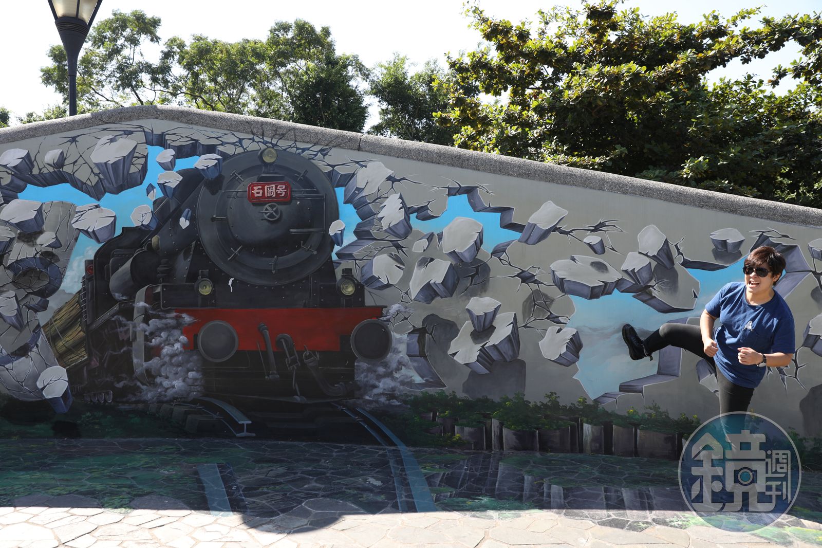 從此處開始的彩繪村之旅,可以看見記錄當年東豐鐵道載送大雪山木頭「火車破牆而出」的畫面。沿著道路向小巷子前行,可以看見彩繪藝術家曾進成為了石岡區特別設計的,融入當地農特產及特色的彩繪畫作。