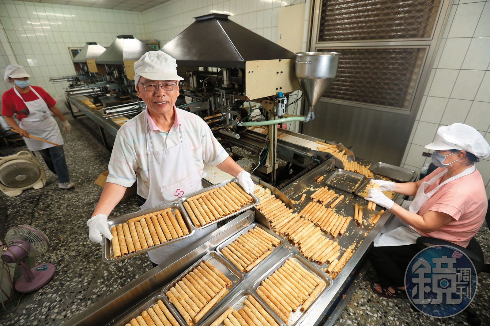 拿著如同教鞭的木頭長棍,曾華誠盯著輸送帶上一根根剛煎好的蛋捲,熟練地依序撥下,穿梭在3台大型自動化煎台之間,他活像蛋捲廠裡的訓導主任。