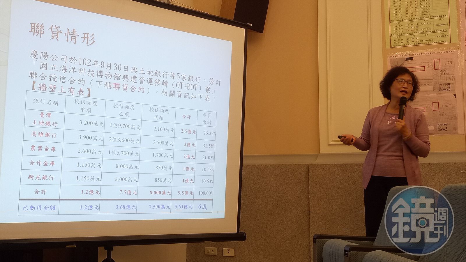 仉桂美指出,海科館BOT案預算為15億元,慶陽與土銀的聯貸合約規定,土銀出6成、慶陽出4成,但慶陽歷次申請動用工程資金,土銀均未實地查核進度,僅憑慶陽的進度證明書及發票就撥款,導致實際進度僅24.87%,但慶陽陳報45.11%,而超撥高達1億5,157萬餘元,變成慶陽根本沒出資,有重大違失,「慶陽視國家法令為無物,非常可惡!」