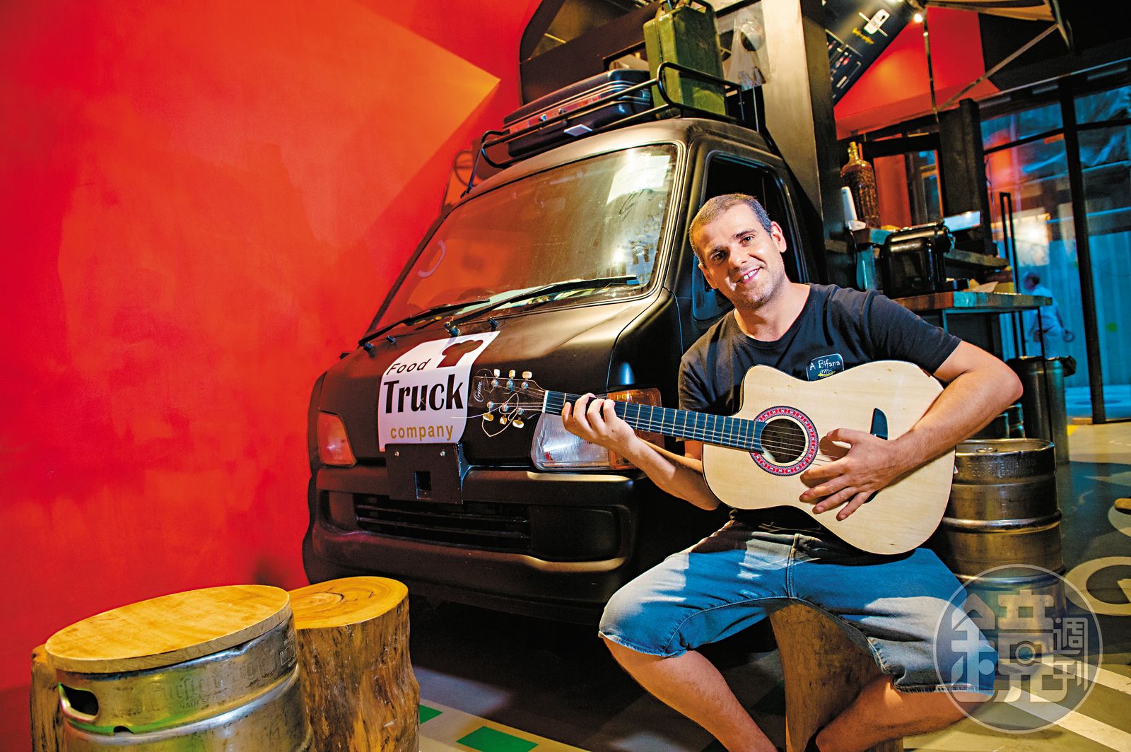 「葡萄牙街頭常可以看到這樣的餐車。」Pedro給小店取了個直接的名字「Food Truck Company」,前後門通向關前後街、關前正街,小街的距離正好是一間房子,他別出心裁在地板畫上道路標誌,天花板上塗滿斑馬線條,黑色餐車正對著一整面的葡國風景,彷彿置身在南歐的街道。