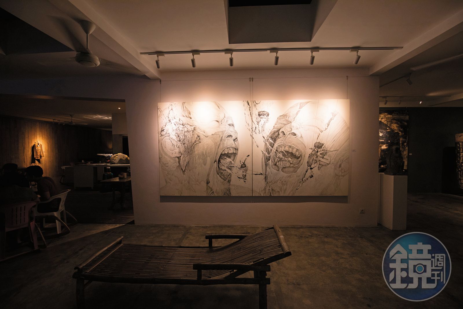 晚上時段的藝廊咖啡館,氣氛比較趨近於酒吧,氣氛輕鬆又有些迷幻。我點了杯用紅酒杯裝的「煙燻冰巧克力」,端上桌時杯內有球型冰塊,巧克力裝在酒杯回收再製的美麗玻璃瓶中,一倒下,褐色液體流過冰塊,杯內傾瀉出誘人畫面。