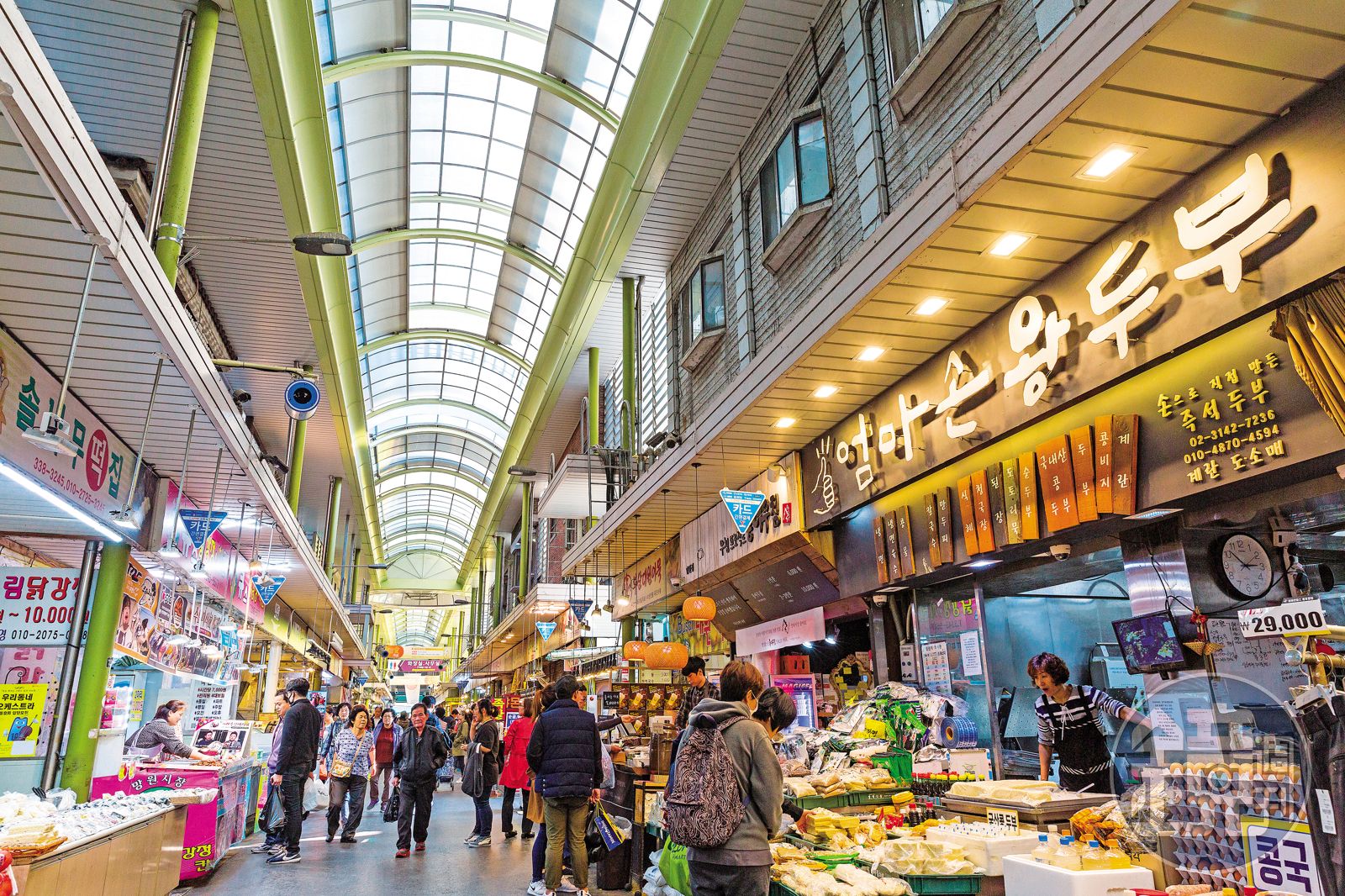 這回輪到我穿街走巷,不見李敬揆口中的施工景象,倒是短短的一條巷內,有咖啡廳、甜點店和花店,每家店雖然不大,生意倒是很火,聚集了型男潮女。市場裡的蔬果、熟食、韓式小菜等各式小攤,是望遠洞居民日常飲食的縮影,散發豔紅色澤的小菜一一秤重販售,光看就讓人腦海中浮現蓬鬆米飯。經過魚攤,地上一點積水也無,我動了動鼻尖確認,的確嗅聞不到惱人腥臭味,乾淨度完全不輸超市。