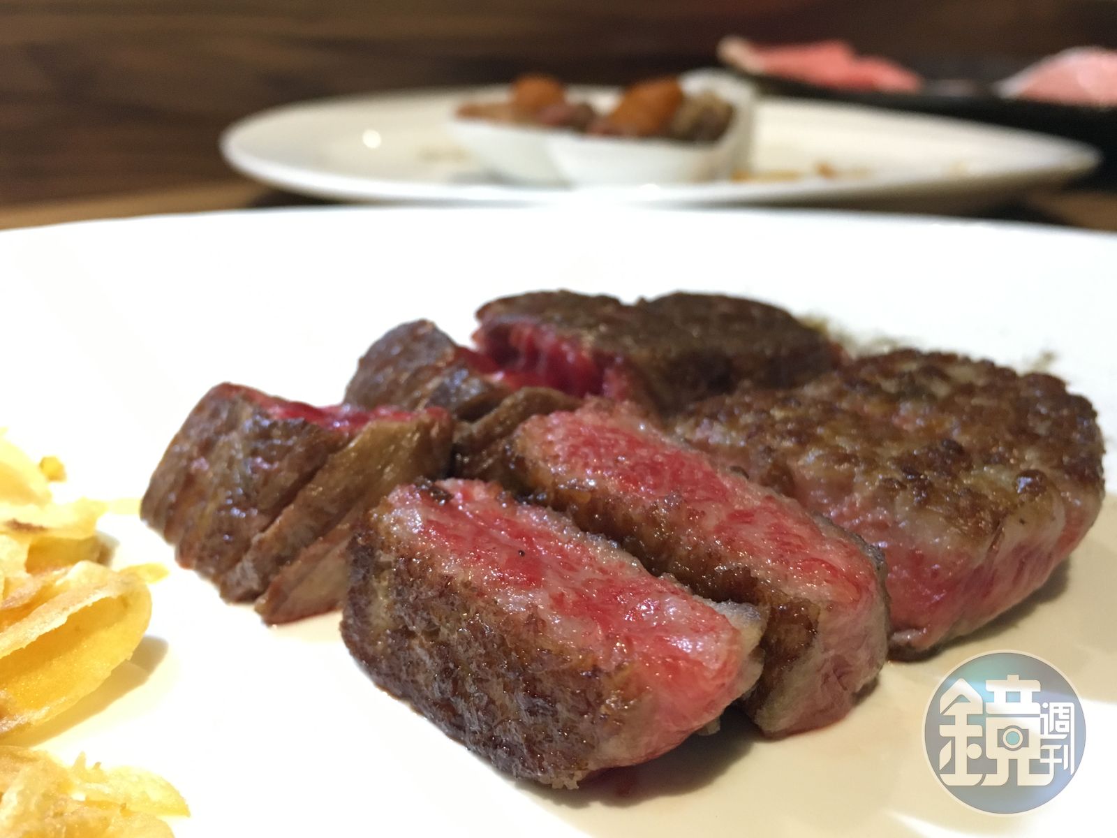 這一波流行的「食尚」逸品,當然非日本和牛莫屬,因此店家特別推出「特7牛雙人套餐」,一次可以吃到7種頂級牛的奢華口感。像是主菜「松阪級和牛牛排A5」就是屬於和牛最高等級,主廚王基明把它在鐵板上香煎到表面焦酥,裡頭介於3至5分熟度,一口咬下油脂直接滑入喉中,夾帶著牛肉的甘美甜香。
