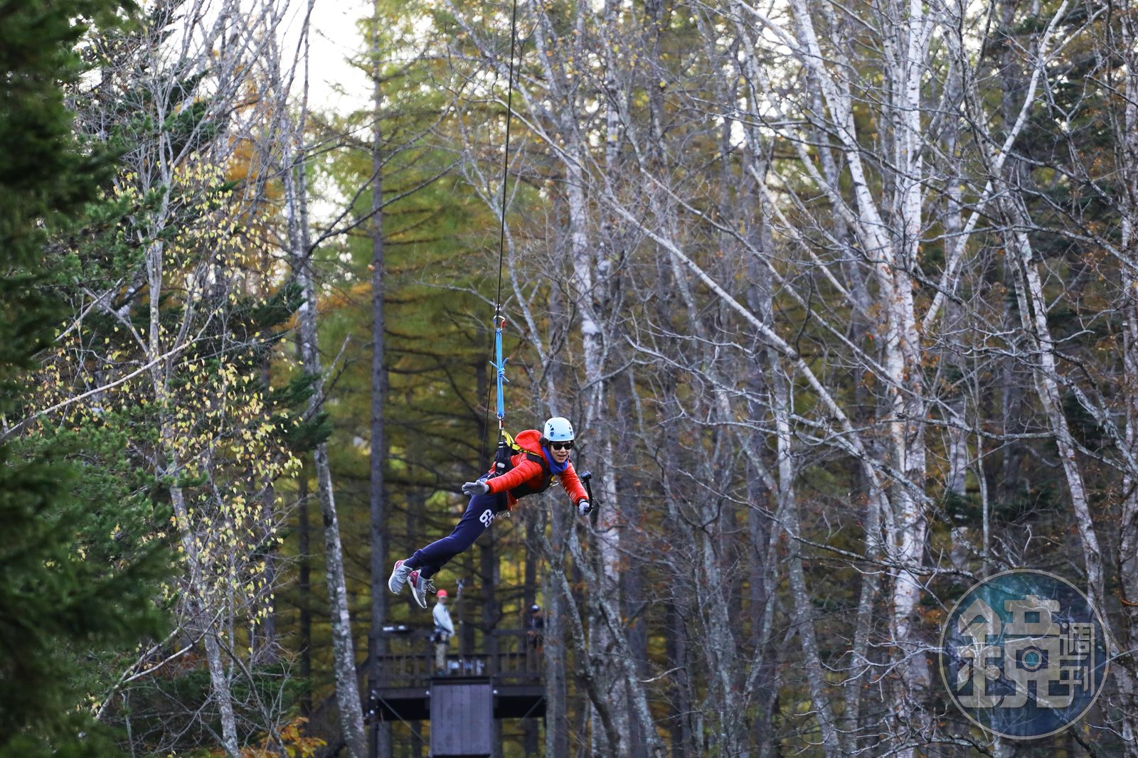 不過,想體驗這趟有點驚險刺激的飛行,可得先穿好裝備,戴上安全頭盔。為了溜上據說是園區裡最長、風景又最美的滑索,我們得爬上一小段山坡,最後才能站上滑索的起飛平台。250公尺的滑索,我「咻!」一下就過去了,實際飛行約40秒,雖然我內心很鎮定,但為了拍攝影片的音效,我一路飆風尖叫,喉嚨都快叫啞了。