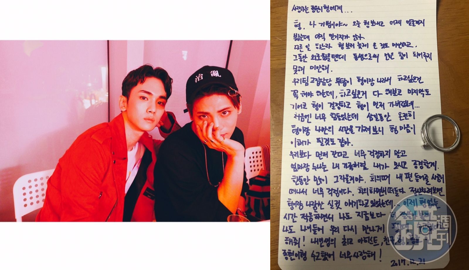 KEY下午更新ig,公開他與鐘鉉的合照,與一張寫給鐘鉉的親筆信,內容提起他對鐘鉉多麼不捨,以後身邊沒有鐘鉉陪伴會有點怕,還寫到「當我們再次碰面的那個時候,請也對我說『你辛苦了』吧!」字字句句透露出對鐘鉉的不捨與難忘。