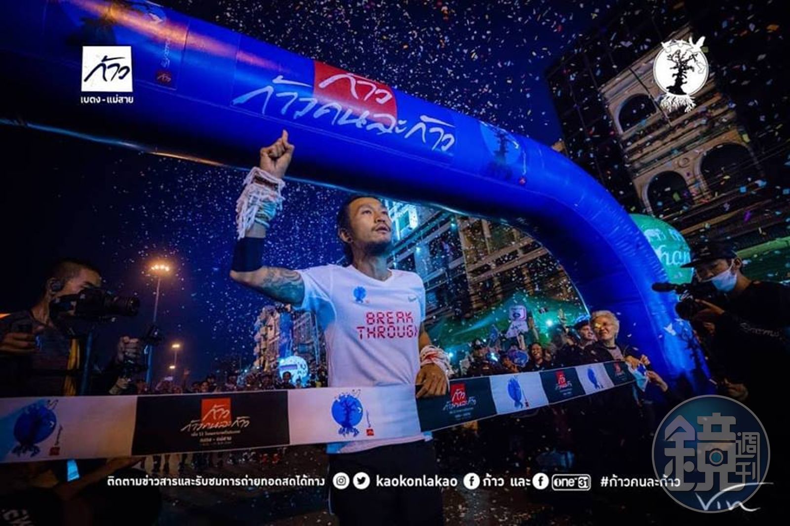 由於是天團主唱,這回11月初他開跑時就受到注目,DJ女友Goi一路陪跑,不只帶動路跑風氣,也帶來很多歡笑與淚水,有人送上點心,有人送上榴槤,他自己也曾舊傷復發差點無法繼續跑下去。跑進終點線那一天,全泰國人都在等待這一刻,Toon說,他感謝路上送水送飯,與送上微笑的人,如果不是每個泰國人的幫忙,他真無法做到這些。