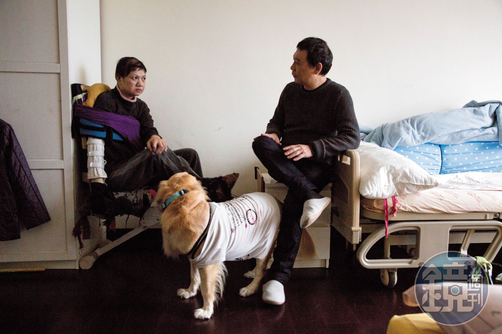 Joanne因重度腦中風,身體無法使喚,大小便失禁,四肢逐漸萎縮僵化,若非用布帶束縛,身體會癱軟倒下。9年來,凌威請一名看護,二人24小時共同照顧她,「早上起床幫她騎車、站立、走路3小時,保持體能,下午也3小時,其餘時間我會陪她看電視,這就是我的家庭生活。」