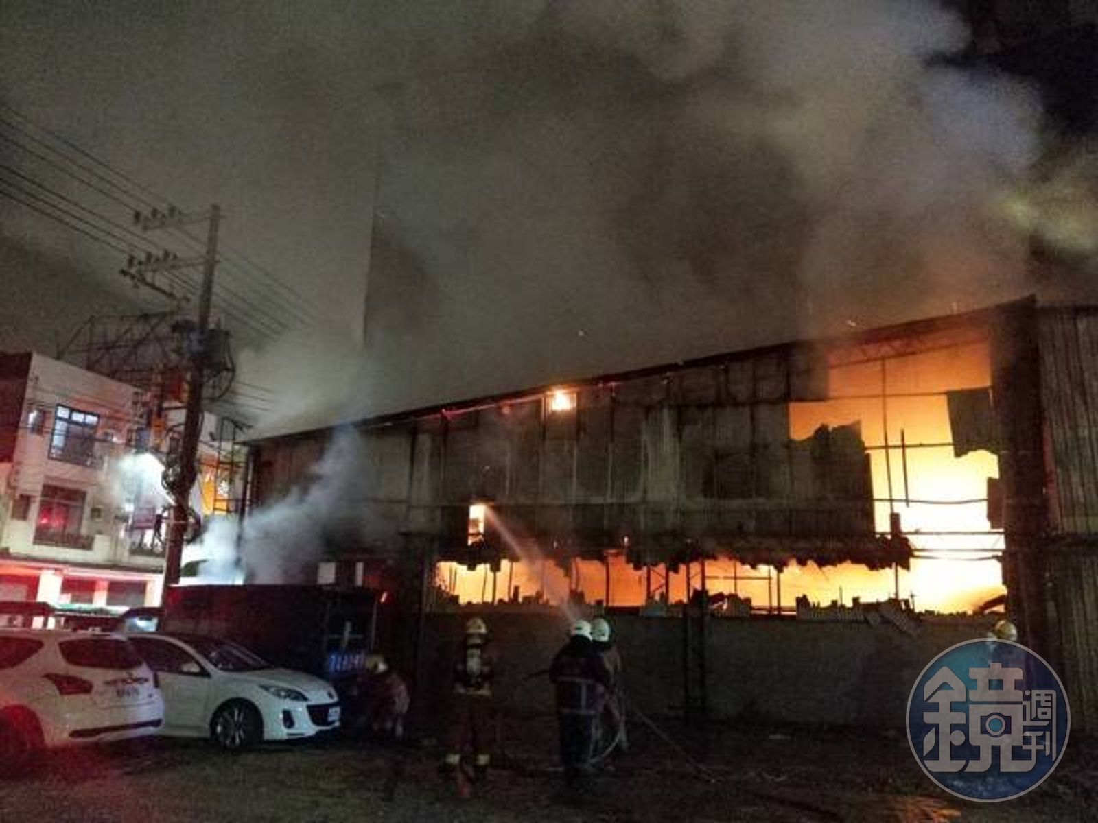 消防局是在今天凌晨3點15分接獲報案,指延平路一段214巷一間汽車保養廠起火燃燒,勤務中心出動消防車25部、警消65人、義消30人前往搶救;警消趕抵現場時,只見大半個廠房已經陷入火海,火舌蔓延得快,於是消防人員佈下7條水線強力灌救,但即使如此,還是差點延燒到隔壁水電行。