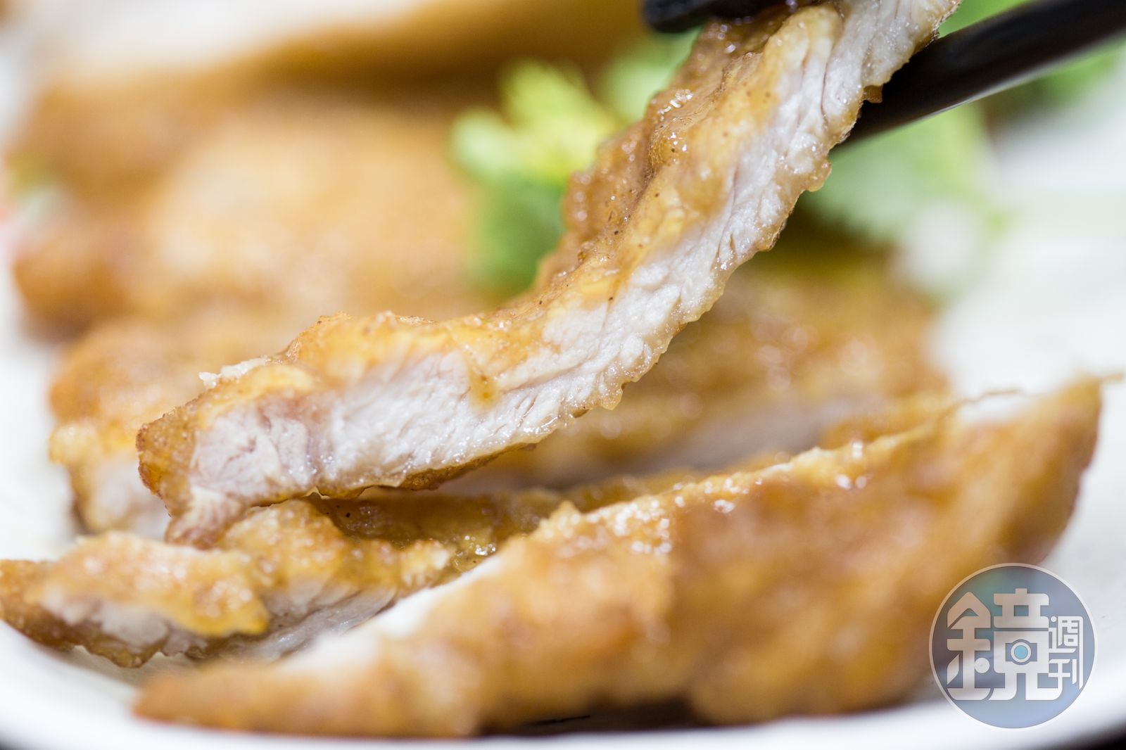 挑選整條里肌肉切片做豬排,肋排切塊做排骨酥,經過手工搥打的肉排呈現粉紅色,施明裕說:「冷凍肉退冰一定白白的,價格可便宜1/3,但我們就是要用現宰肉,吃起來彈性差很多,畢竟生意是要做長久的,不是做一天兩天,所以一定要用好的肉。」