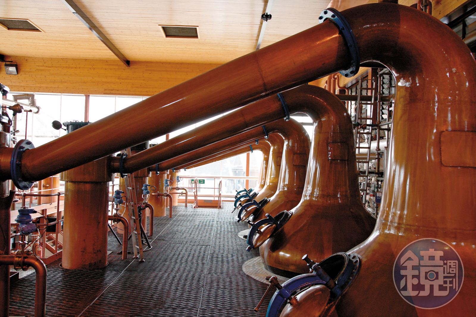 蒸餾器就像是酒廠的靈魂,不同大小與形狀的蒸餾器能夠釀造出不同特質與品質的威士忌。麥卡倫酒廠占地390英畝,然而在如此廣大的腹地之下,使用的卻是斯佩賽產區中尺寸最為小巧的蒸餾器。