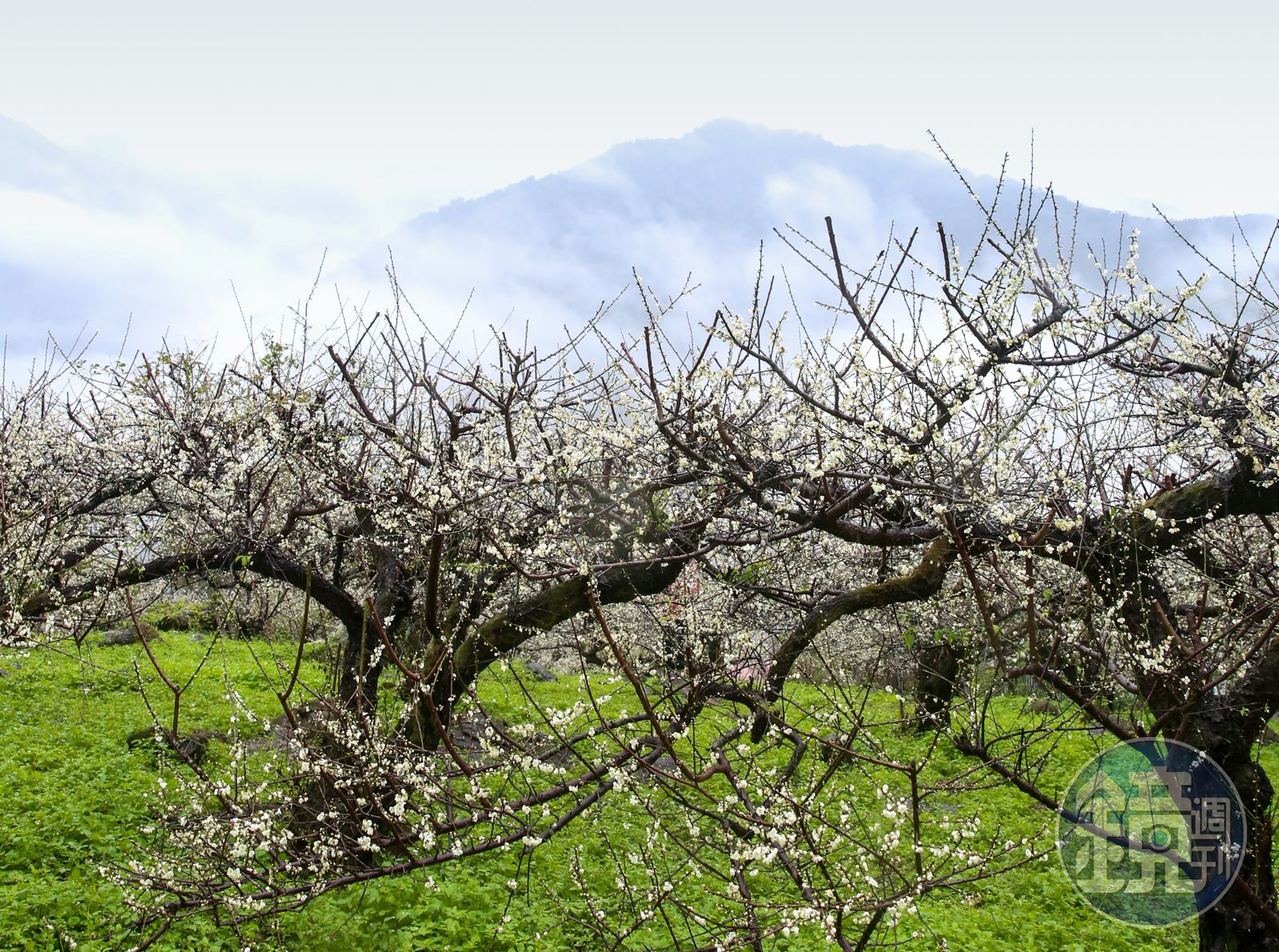 陰雨天裡,平日的梅園格外顯得寧靜,此時後方群山出現的雲霧山嵐,猶如暈染開來的山景,彷如國畫中黑色蒼勁的樹幹、含羞花苞的一枝梅、掛著水珠的五瓣淡雅白色花朵,沒有擁擠人潮,反而讓我自然而然放慢腳步,恣意地賞著梅花,用手機一張張留下它的美麗姿態。
