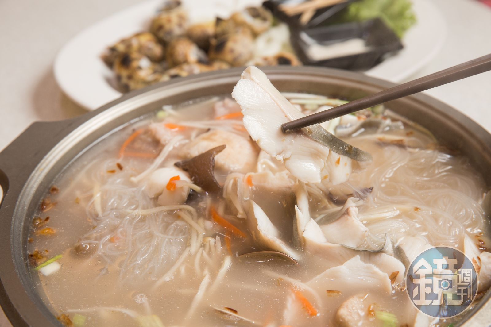 由於海鮮魚貨夠新鮮,多道料理只需簡單川燙、鹽烤就能品嘗鮮甜滋味,唯獨鯧魚二吃較費工,店家將魚肉片下,舖在用海鮮高湯熬煮的米粉湯上,配料包括香菇絲、芋頭、油蔥酥,經小火煨煮更顯濃郁,冷天喝上一碗暖心又暖胃,一會兒服務生端上一盤拼成魚形的酥炸鯧魚骨,酥脆魚骨旁還帶點魚肉,兼具2種口感,沾點胡椒粉就是一道下酒菜。
