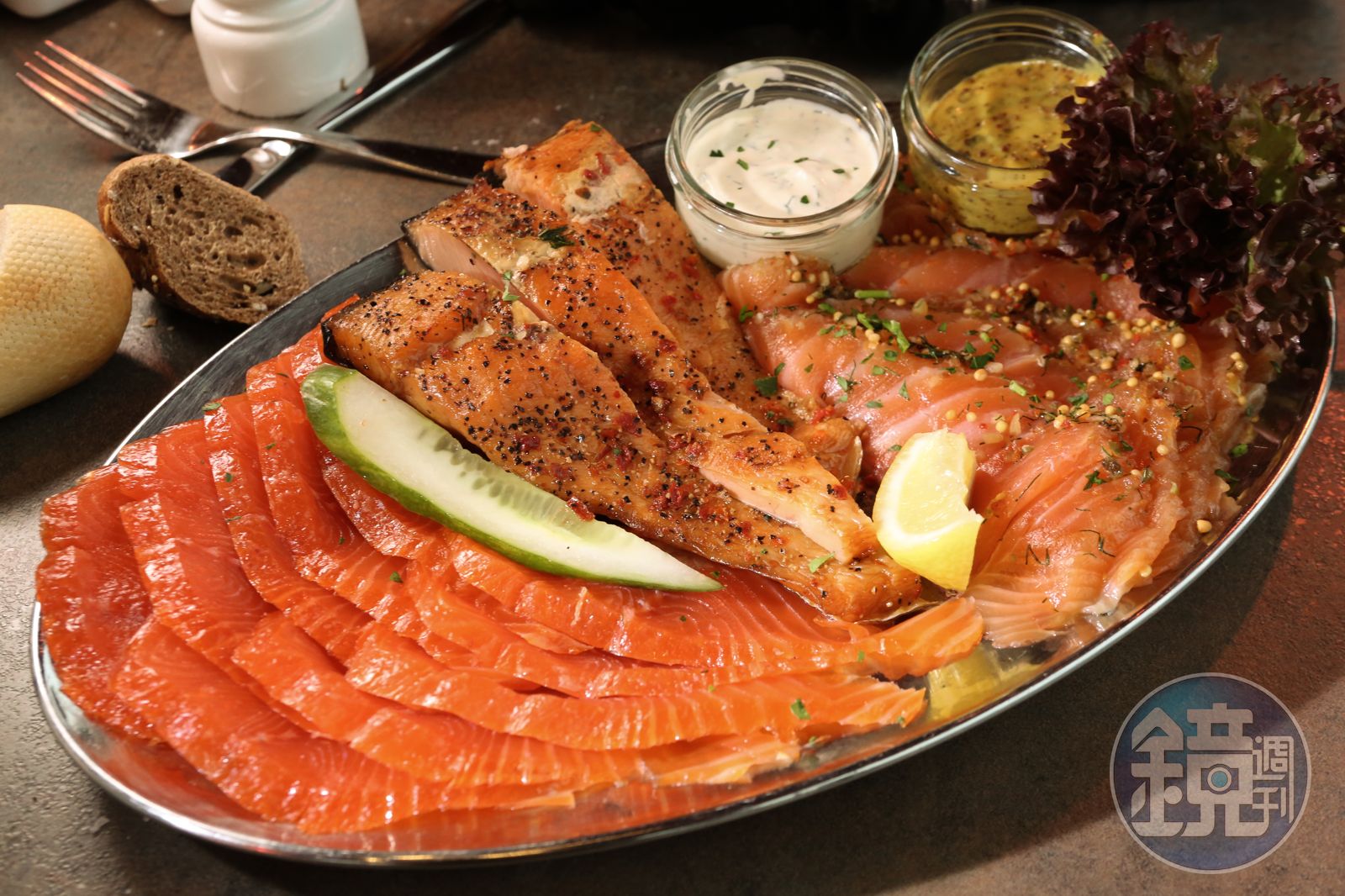 回到台灣,誠品行旅西餐總主廚林玉罡充分展現了鮭魚在西餐料理的極致。「挪威鮭魚的甜度高、油脂豐富,從頭到尾都能毫不浪費的使用。」好比第一道開胃菜,他將鮭魚以糖、鹽、八角、丁香、杜松子及新鮮柑橘等醃漬36小時後,去表面硬皮切丁,配上蟹肉沙拉淋上油醋與優格醬,肉質生嫩、清新爽口。