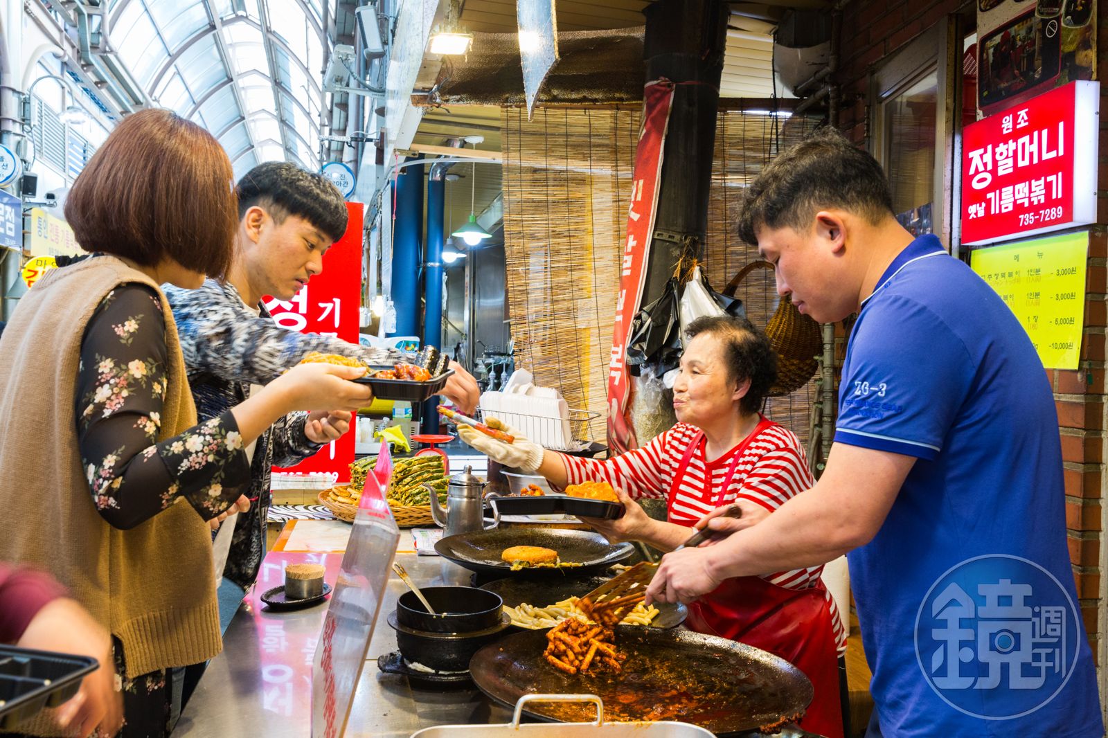 正午之前,人潮逐漸湧入,市場裡空氣中的騷動讓我一陣緊張,我加快速度三步併兩步朝「元祖鄭奶奶油炒年糕」出發,據說市場裡最紅的年糕店原是另一家,直到多年前有位美國國務卿專程來此品嘗,不巧碰上店家休息沒營業,於是國務卿就轉向元祖鄭奶奶,天上掉下來的機運,讓攤子成了市場名店。