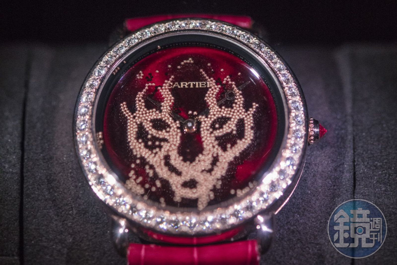 卡地亞今年最有話題性的作品,是這款Revelation D'une Panthere 美洲豹「沙漏」腕錶。此錶面盤上的水晶玻璃,雕刻出一個豹臉形狀的夾層,然後注入特製溶液,與無數顆細微的小金珠,之後再完全密封住,組裝進入手錶的面盤之上。只要手錶輕輕地轉動,在地心引力牽動之下,金珠就像沙漏一般傾洩而下,顯現出美洲豹的臉。而內部的溶液,則讓金珠可以緩緩流動,速度不至於太快,豹臉的效果更加明顯。這款錶一秀出來,直叫現場眾人驚呼連連,是今年最叫人驚喜的錶款之一。
