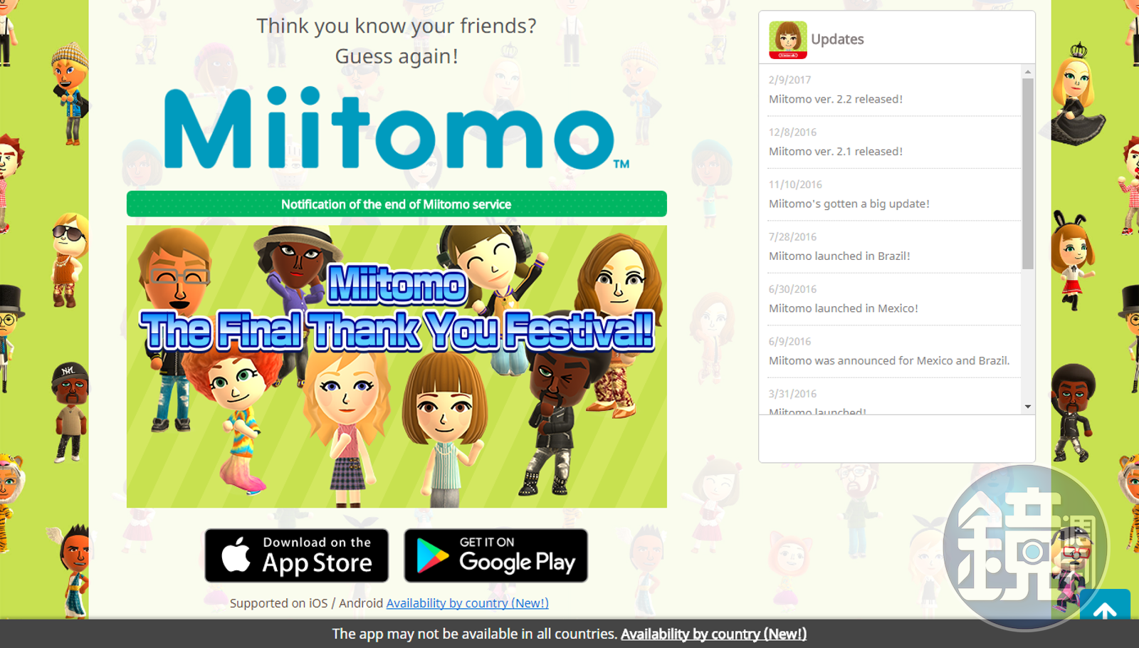 雖然遊戲在開始營運的 2 個月內就宣布玩家人數突破千萬,後來活躍用戶數卻萎靡不振,最後任天堂宣布《 Miitomo 》在今年 5 月 9 日 16:00 (日本時間)結束營運,並已在 1 月 25 日停止販賣遊戲內貨幣「 Miitomo Coin 」。在遊戲正式結束營運之前,玩家仍能在遊戲中使用「商店」以及「おとして Miitomo 」的遊戲功能,以便將在遊戲中購買的遊戲幣消耗完畢。官方企劃「最後的大感謝祭﹞活動,加碼提供遊戲幣和遊戲券作為期間登錄獎品。根據日本法令,《 Miitomo 》將在結束營運後返還玩家在遊戲中購買卻未使用完的 Miitomo Coin ,詳情將在結束營運後的官方網站公布。任天堂發言人表示,結束《 Miitomo 》營運的決定,是為了將資源集中在其他手機 APP 上,比如《超級瑪利歐酷跑》、《動物之森:口袋營地》、《聖火降魔錄 英雄雲集》和其他可能正在製作的全新手遊。