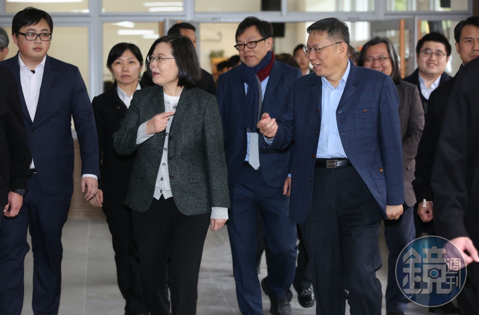 這場考察表定下午3點開始,小英車隊3點03分到達現場,柯文哲從2點45分就由副市長林欽榮、都發局長林洲民等市府首長在公宅門口,不敢再重蹈前一次讓行政院長賴清德等他的凸槌再度發生。