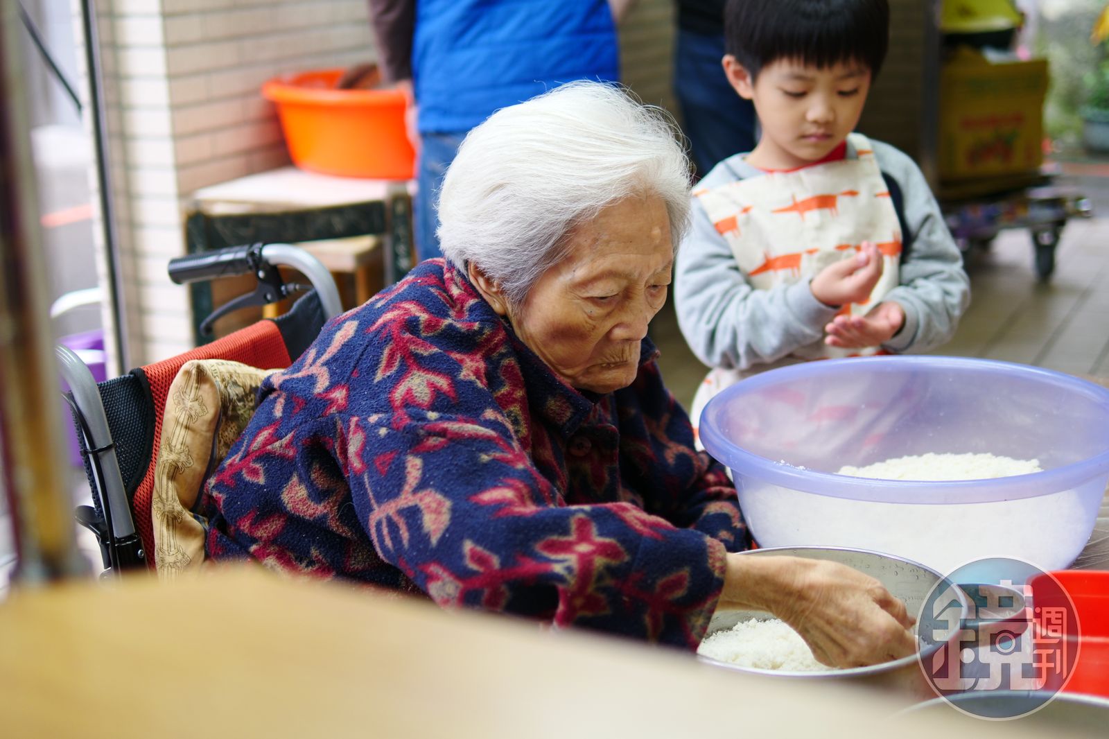 孫子袁翊倫從小看奶奶做糕長大,在旁邊跟著學,說她最在意的是和粉、搓粉,「我們糯米乾粉,和水、糖分量都按照奶奶的比例,水多了會太濕,少了會太乾。」和粉力道有剛有柔,輕輕撥、搓,粉球才均勻,就連才5歲的外曾孫,也會幫忙去棗核備料。一塊年糕凝聚了4代情,難怪老客人會說,吃到袁媽媽年糕,才算過年。