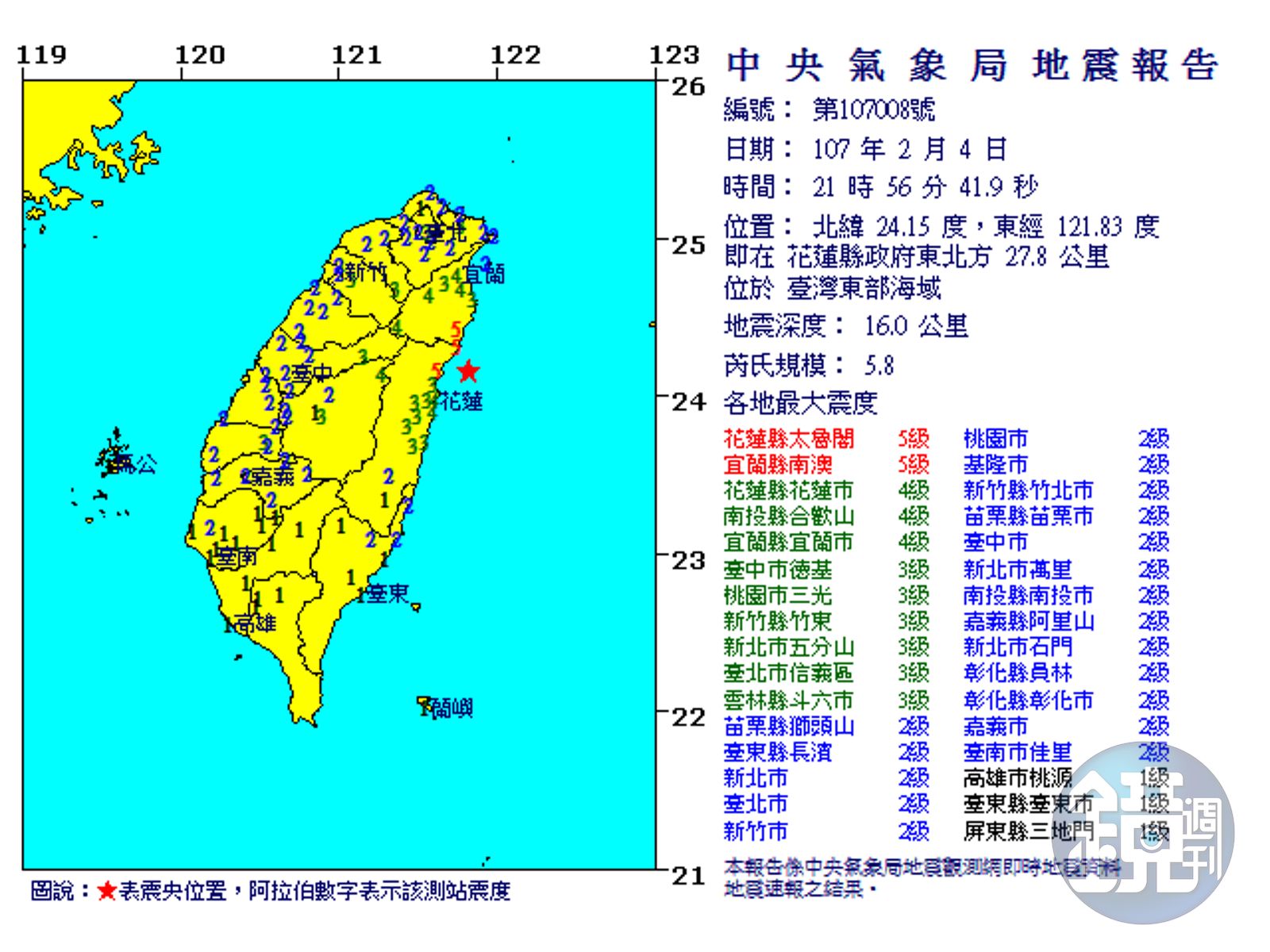 今晚地牛翻身,連續出現7個規模4以上的有感地震,台北感受主要是左右搖晃,中央氣象局地震測報中心的資料顯示,這7個地震震央都在花蓮縣政府北偏東方23至29公里之間,深度5到16公里,其中最大的規模5.8,花蓮太魯閣與宜蘭南澳都測到五級震度。
