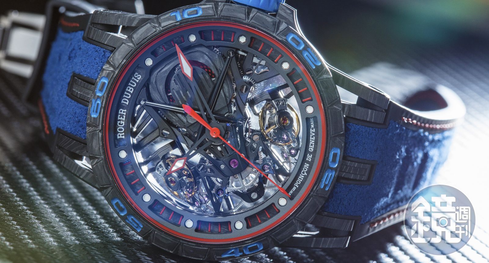 《Excalibur Aventador S》錶殼使用來自於LAMBORGHINI的專利C-SMC(片狀塑模)碳纖維材質,搭配藍紅裝飾和精緻的海王星藍色面錶帶與一鍵快拆裝置,展現出超跑才有的強悍設計美學。機芯:手上鏈機芯/功能:時、分、跳秒指示;動力儲存顯示/建議售價:NT$5,950,000,限量88只