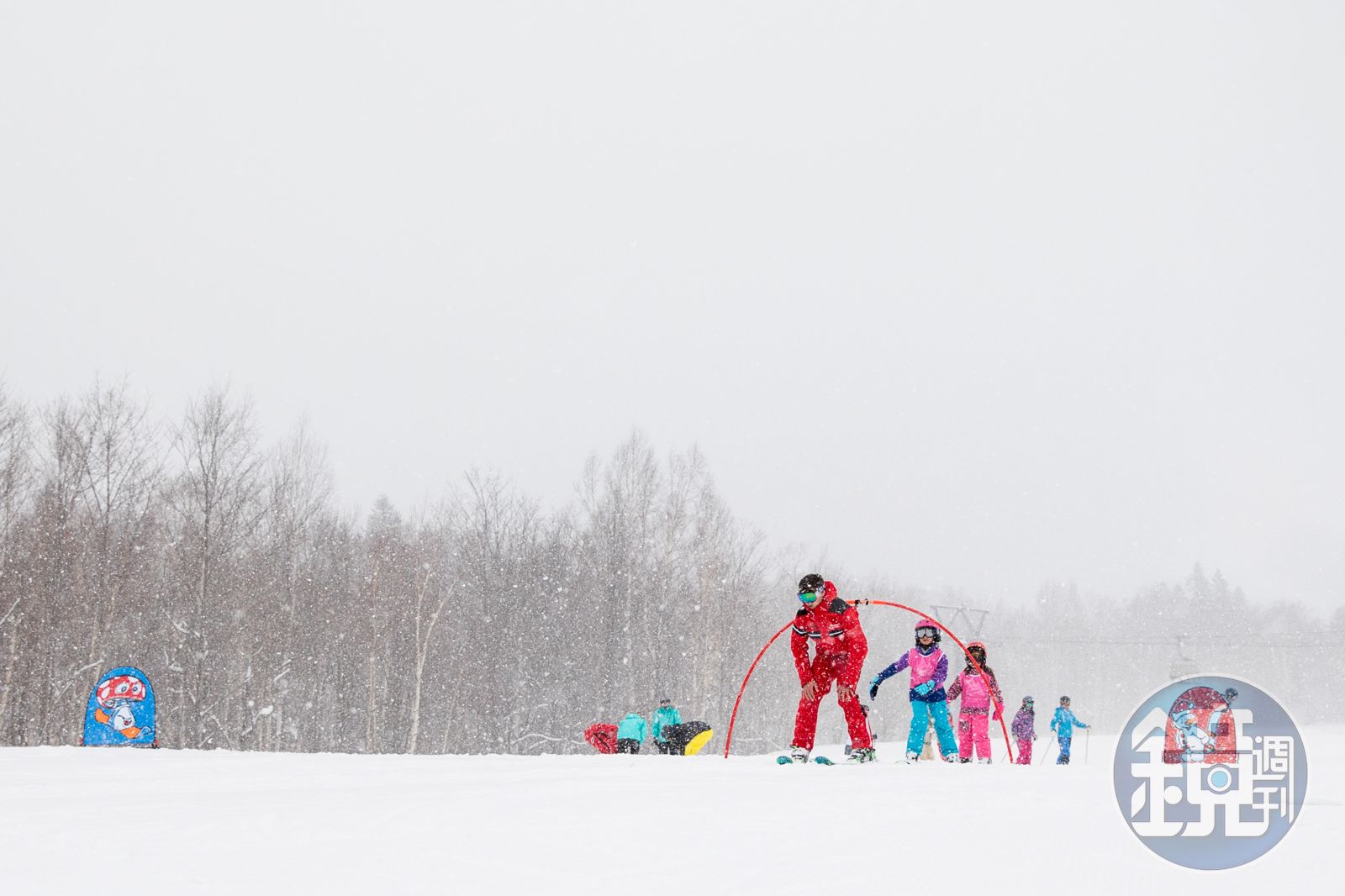 在基礎滑雪場(Magic carpet),可以看到不同國籍的萌小孩,「Club Med Tomamu」同樣提供孩童的滑雪課程,但只有4到6歲、7到10歲的小朋友們可以參加,看著小朋友們滑雪比我們還厲害,心中好生羨慕。